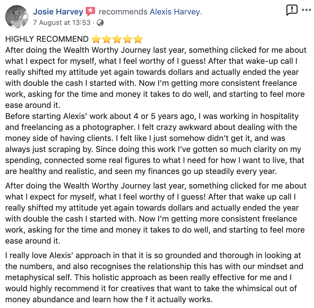 I feel like I now have all the resources I need for a lifelong, healthy, magical and practical connection with money. I can’t tell you how great it feels to finally have the skills I was longing for through my twenties. I only wish I could have done this course at the age of 18 or 20.”