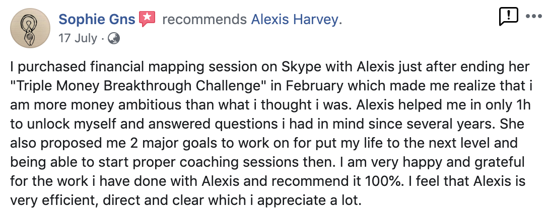 I definitely got a lot out of the one hour session and now feel confident that I can better achieve my money goals. I would highly recommend her for anyone wanting more clarity on what might be holding them back.